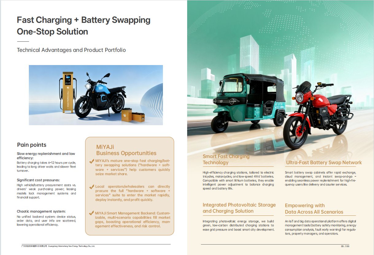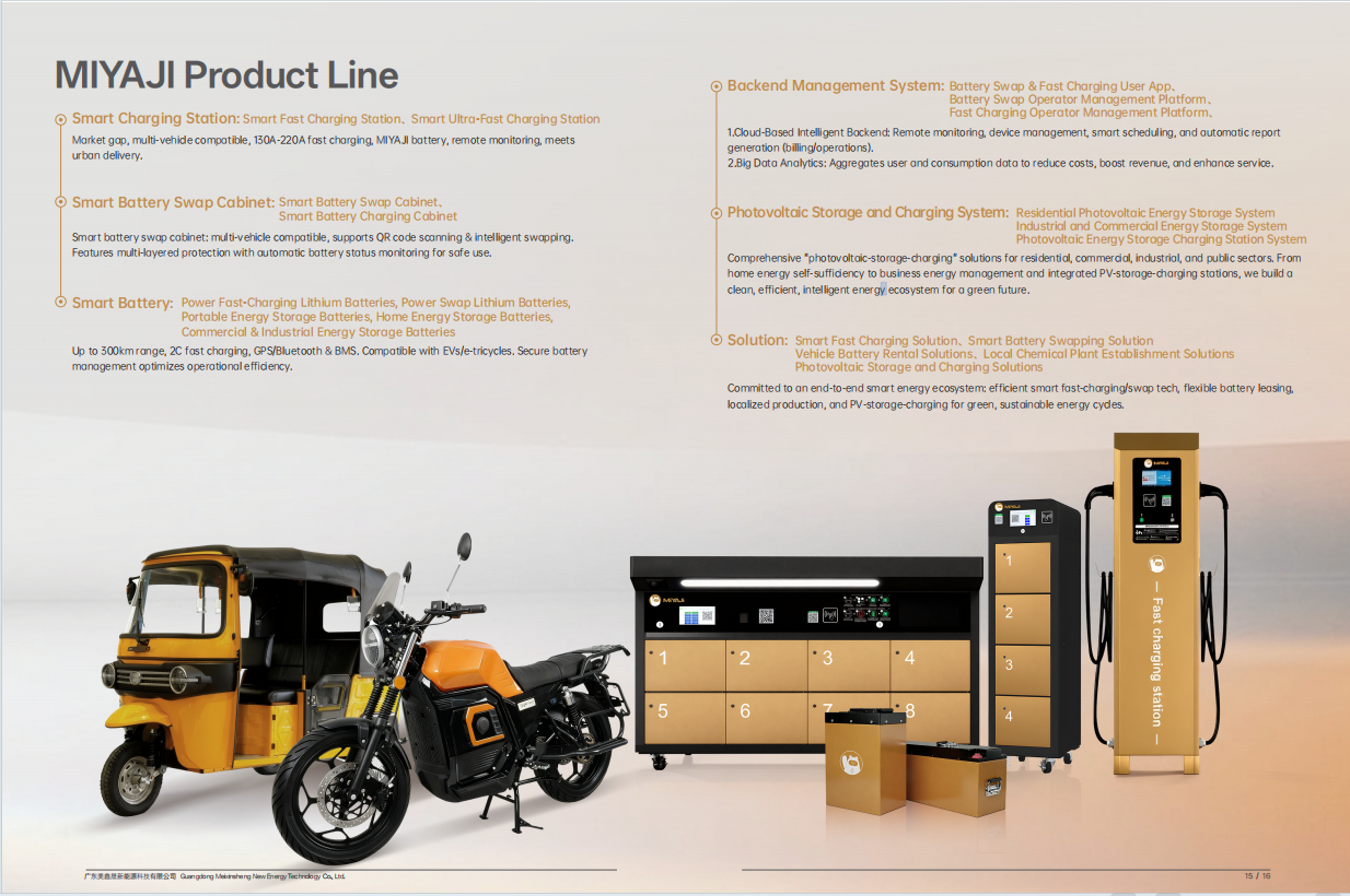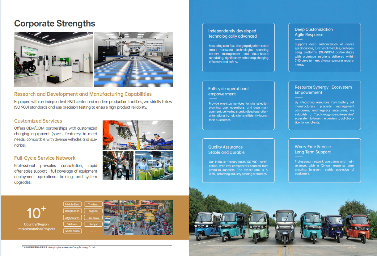 Guangdong Meixinsheng New Energy Technology Co., Ltd. is a leading provider of integrated fast charging and battery swapping solutions in China. Focusing on empowering global low-speed green mobility with its independently developed technologies, its product portfolio covers electric vehicles, power batteries, fast charging stations, intelligent battery swapping cabinets, and back-end management software. It provides full-chain services from hardware customization to software adaptation.