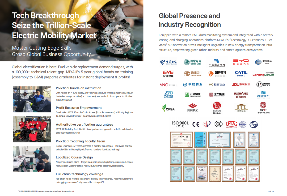 MIYAJI's full-chain technology training focuses on the global electrification boom and addresses the talent shortage in the electric mobility market. It condenses 5 years of overseas practical experience into a comprehensive "battery swapping + fast charging (vehicle + electricity + hardware and software)" course. The training is centered on "70% hands-on practice + 30% theory," equipped with over 50 sets of training equipment and instructors with over 5 years of overseas experience. It covers four modules: vehicle assembly, core lithium battery technology, hardware and software collaborative debugging, and entrepreneurial operation empowerment, specifically addressing pain points in overseas scenarios such as high-temperature adaptation and waterproofing. The course lasts 14 days, with a single enrollment fee of $2500 and a group fee of $2000 (including accommodation and meals) for groups of 3. Graduates can access MIYAJI supply chain resources, receive authoritative certification, and are guaranteed to graduate even with no prior experience. This program is suitable for four types of people: technology professionals, entrepreneurs, and corporate teams. Students from Afghanistan, Nigeria, Ghana, and other countries have already achieved results such as earning over $5,000 in three months and a monthly net profit of $20,000. Places are limited, and customized programs are available for companies.
